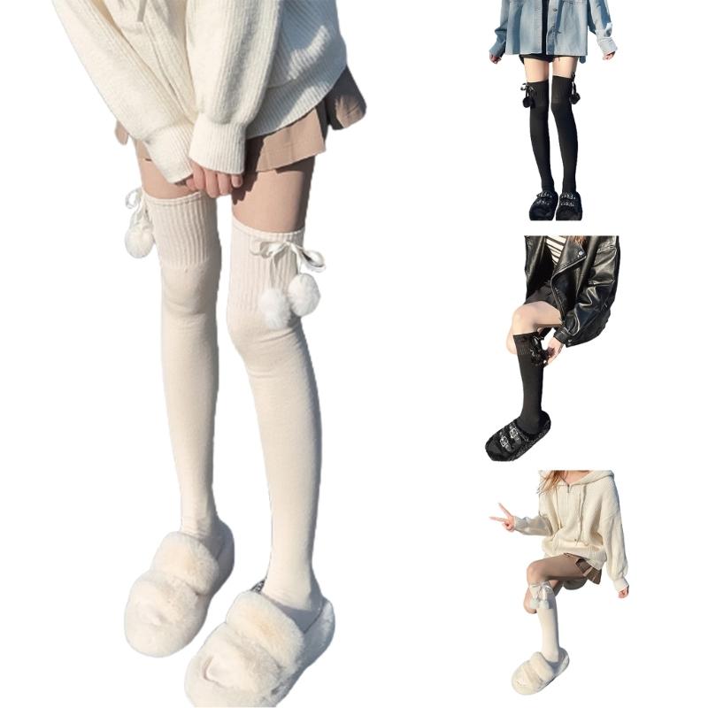 Damen kniehohe Socken Strümpfe Lolitas Schleife Schnürung Wadenstrümpfe Bommel Oberschenkelhohe Strümpfe Süß Niedlich Überknie-Socken