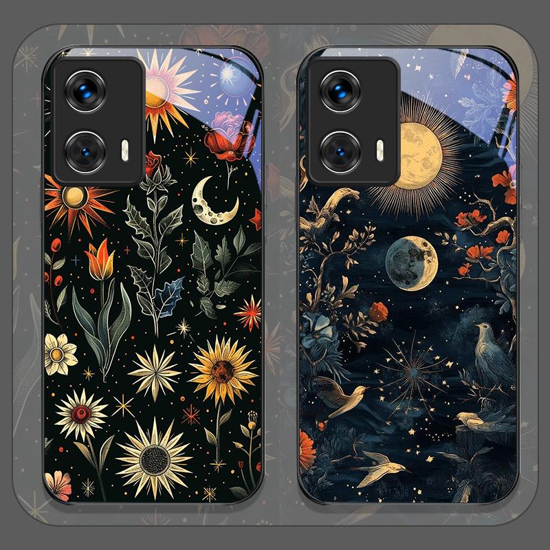 Ästhetisches Sonnenblumen- und Mondmuster Gehärtetes Glas Handyhülle für Motorola Moto Edge 50 Fusion 40 Neo 30 Pro G85 G84 G54 Abdeckung