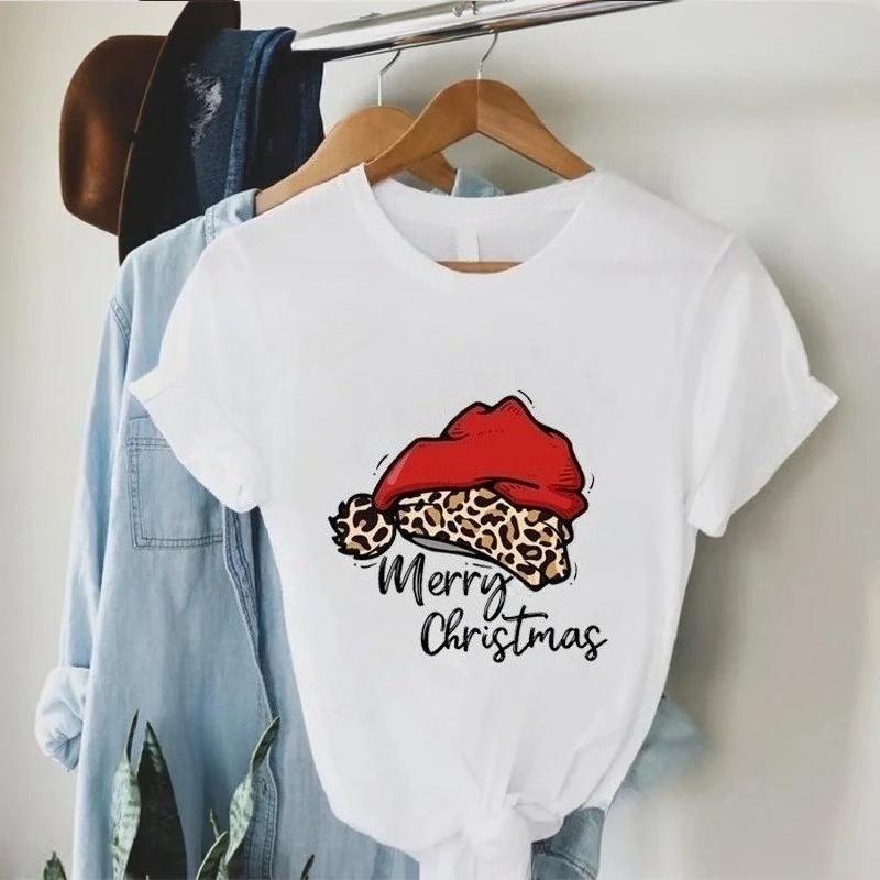 Womens short sleeved Tshirt summer leopard print Christmas hat Merry Christmas print fashionable and trendy Womens Tshirt