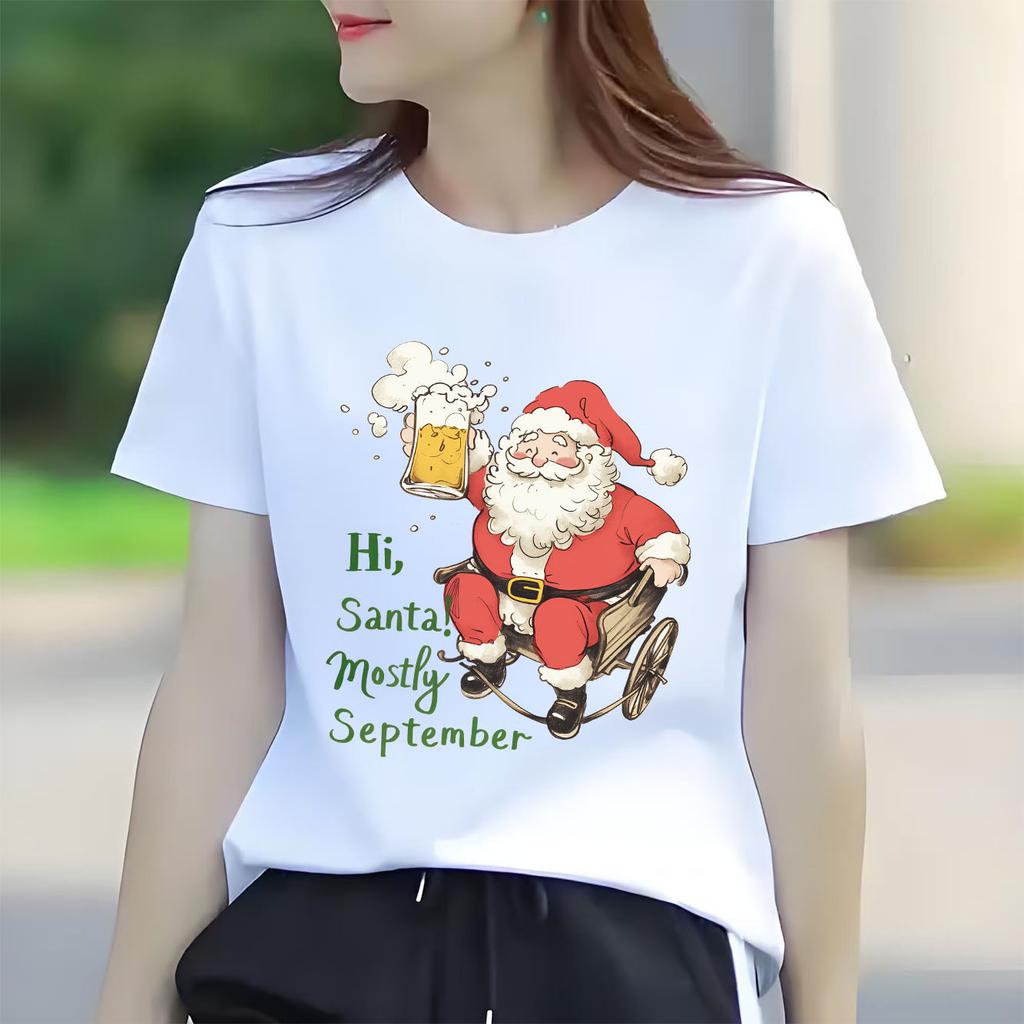Merry Christmas Santa Claus Cheers Beer Fun Printed Pattern Tshirt Short Sleeve Round Neck Versatile Womens Tshirt