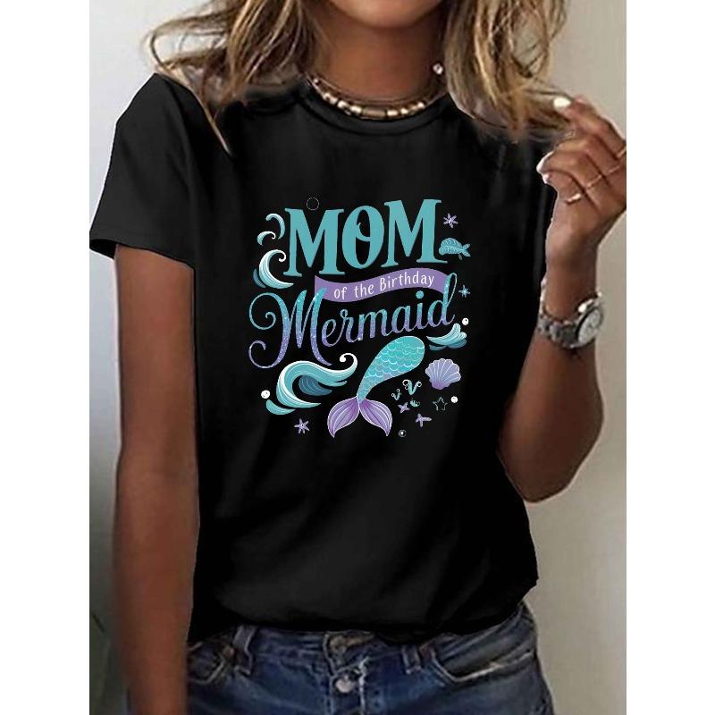 Women's Mom of The Birthday Mermaid Print Tee Crew Neck Short Sleeve Casual Spring Summer Top