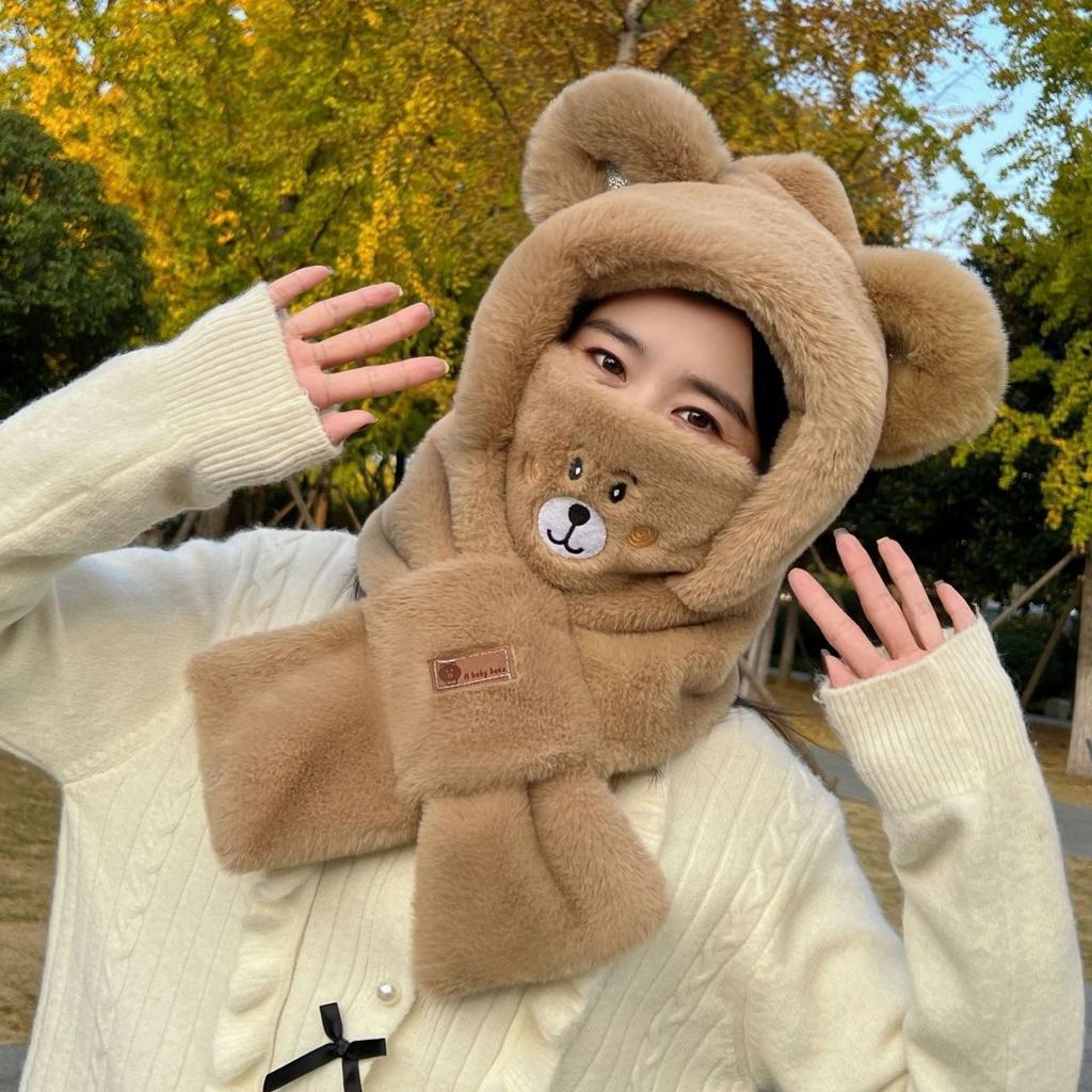 Winter Plüsch niedliche Bärenohren Schal Mütze und Masken-Kombination für Damen, dreiteiliges Set für Radfahren, Kälteschutz und Wärme