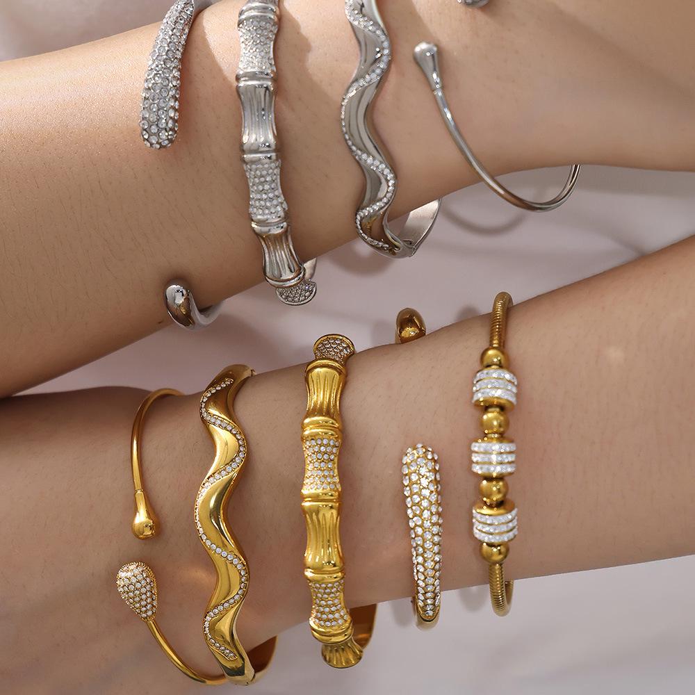 18K Goldbeschichteter Edelstahl Zirkon Geometrisches Offenes Armreif-Set