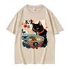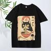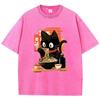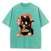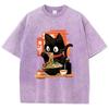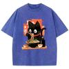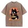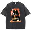 Streetwear T-Shirt Vintage Gewaschenes Baumwoll-T-Shirt Schwarz Ramen Katze Japanischer Anime-Stil Grafik-T-Shirt Lässig Frühling Sommer