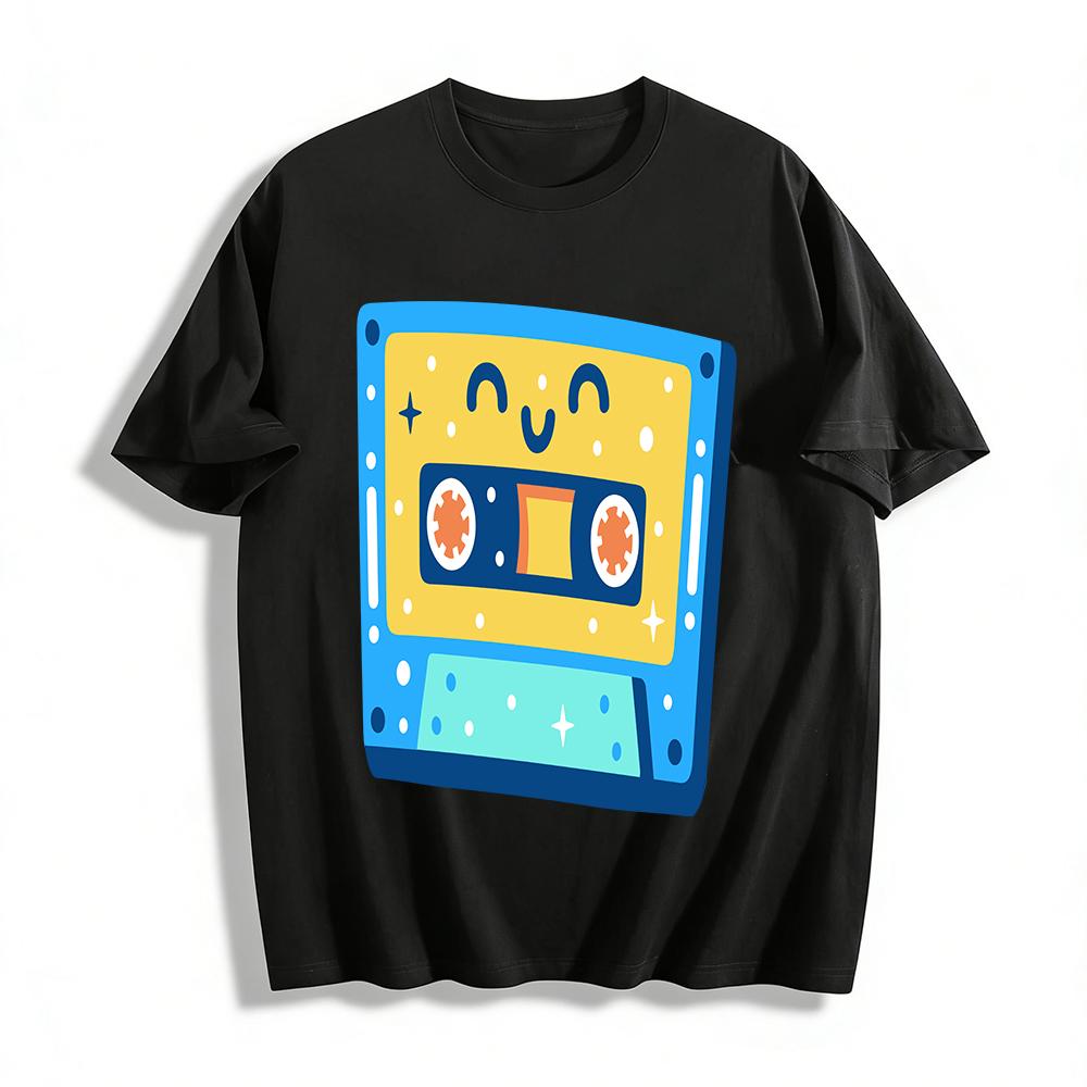 Retro Smiley Face Cassette Print T-Shirt Unisex Vintage Casual Loose Crew Neck Top Pure cotton T-shirt