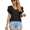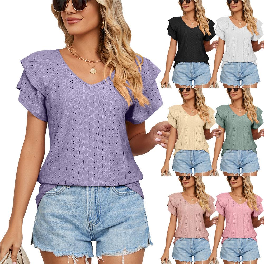 Womens Summer Eyelet Tops V Neck Double Ruffle Sleeve Casual Blouse Shirts Loose Fit Tops