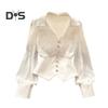 Women French Style Shirt Lapel V Neck Puff Long Sleeve Shirt Buttons Decor Irregular Hem Solid Color Tops