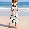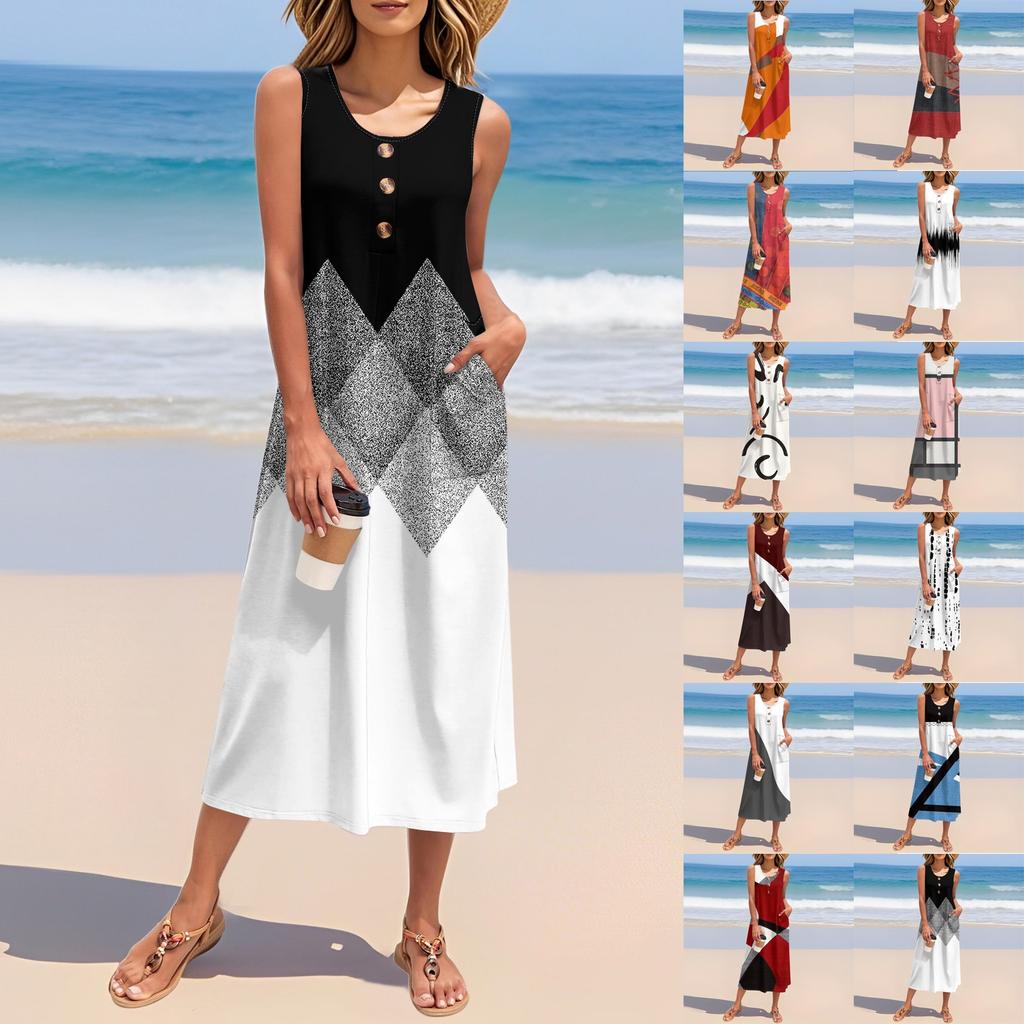 Women's Summer Vintage Color-block Patchwork Print Dress Sleeveless Button Down Casual Loose Long Beach Sundress