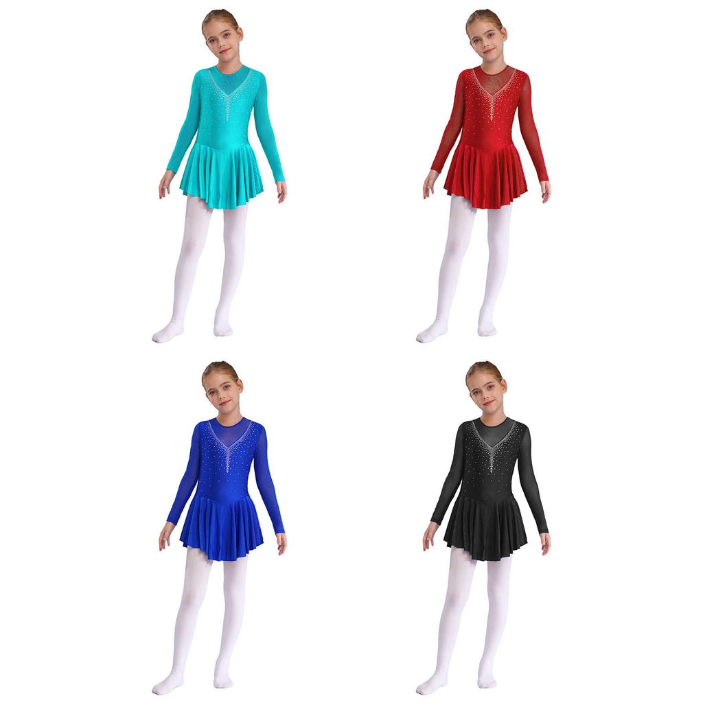 Girls Hollow Back Skating Dress Long Sleeve Round Neck V-Shape Rhinestone Patchwork Performance Outfit