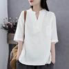 Literary and Retro Summer New V-neck Cotton and Linen Top Showing Thin Temperament Short-sleeved T-shirt Women's Loose and Casual