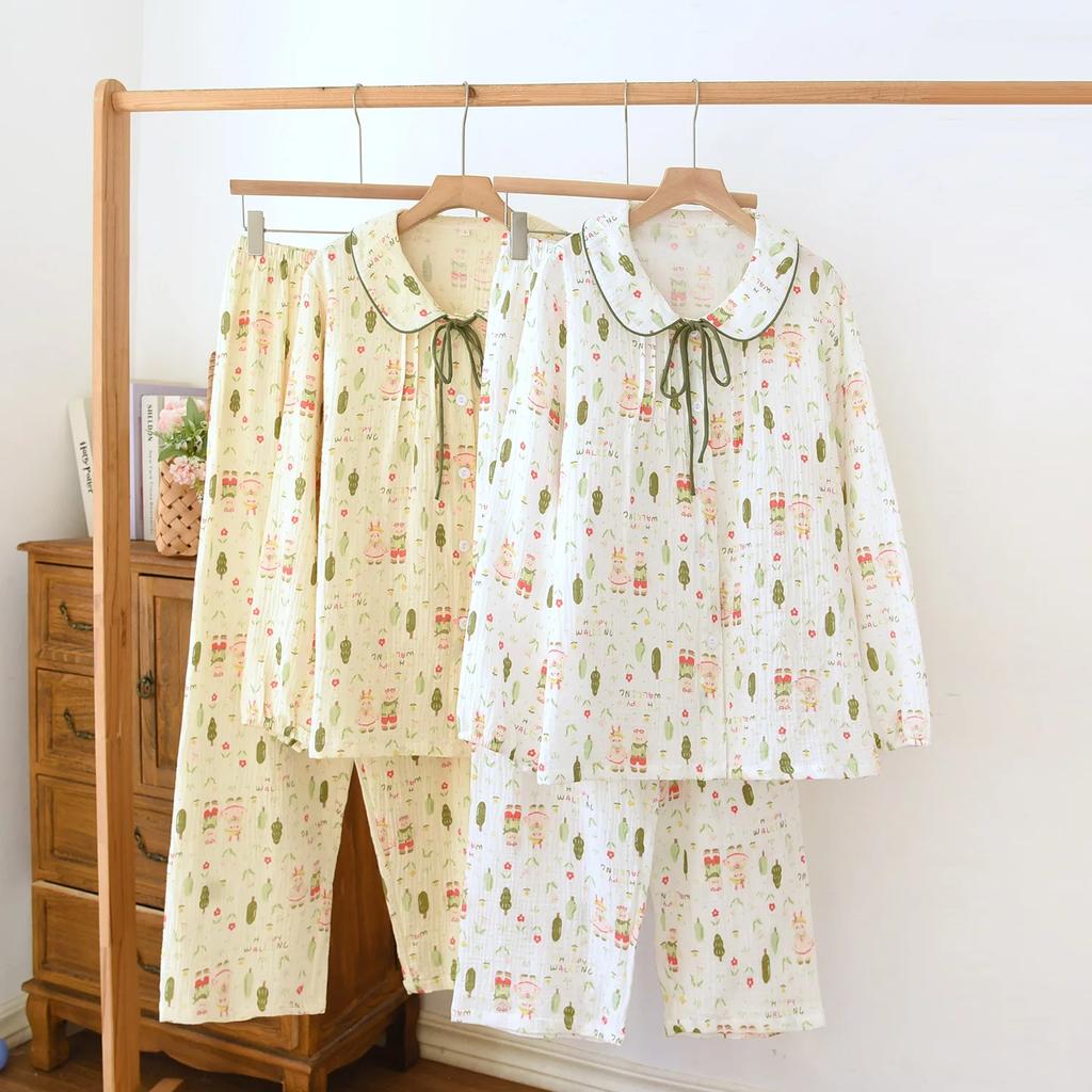 2025 New Spring/Summer Women's Pajama Set 100% Cotton Crepe Small Fresh Sweet Long Sleeve Long Pants Two Piece Home Clothes