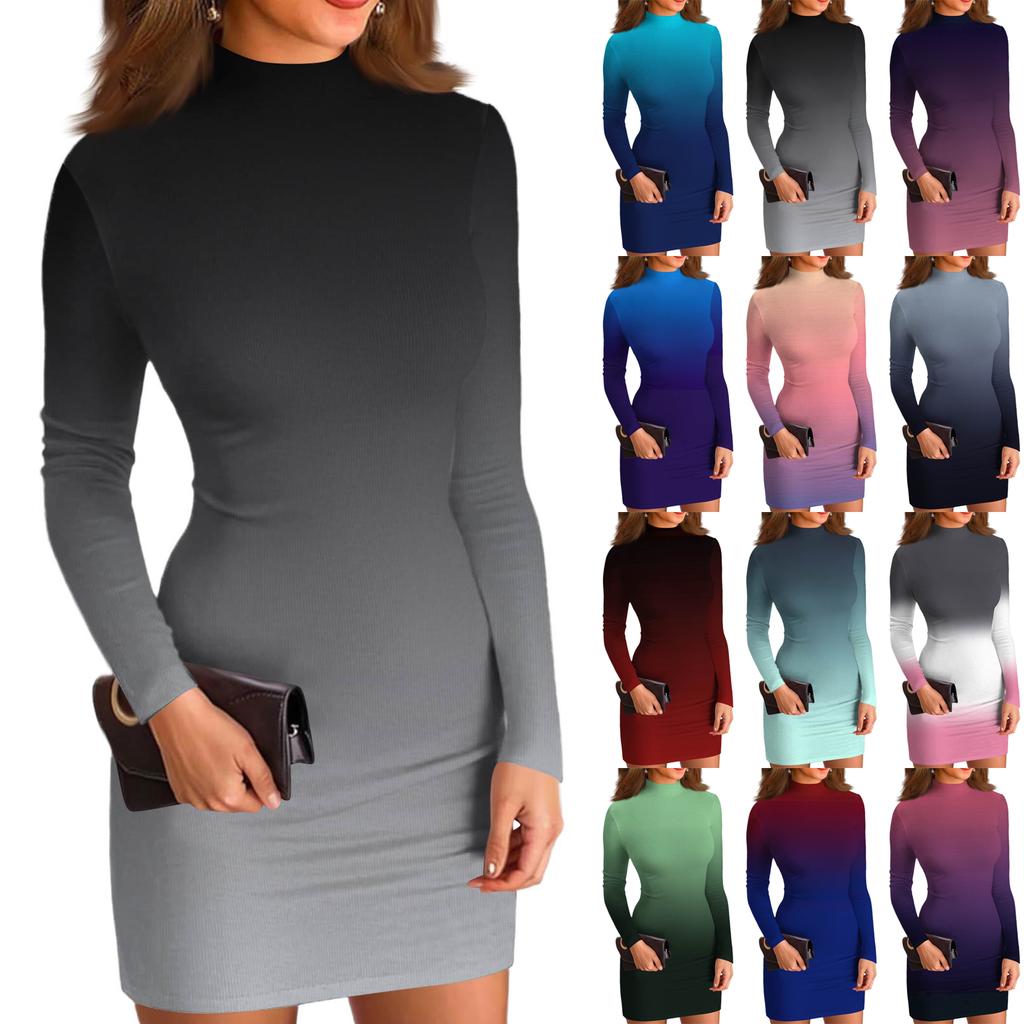 Women's High-Neck Casual Long-Sleeved Gradient-Printed Slim-Fit Dress