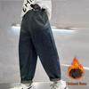 2025 Autumn/Winter Boys' Fleece-Lined Thick Jeans - Trendy & Warm One-Piece Pants for Kids
