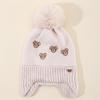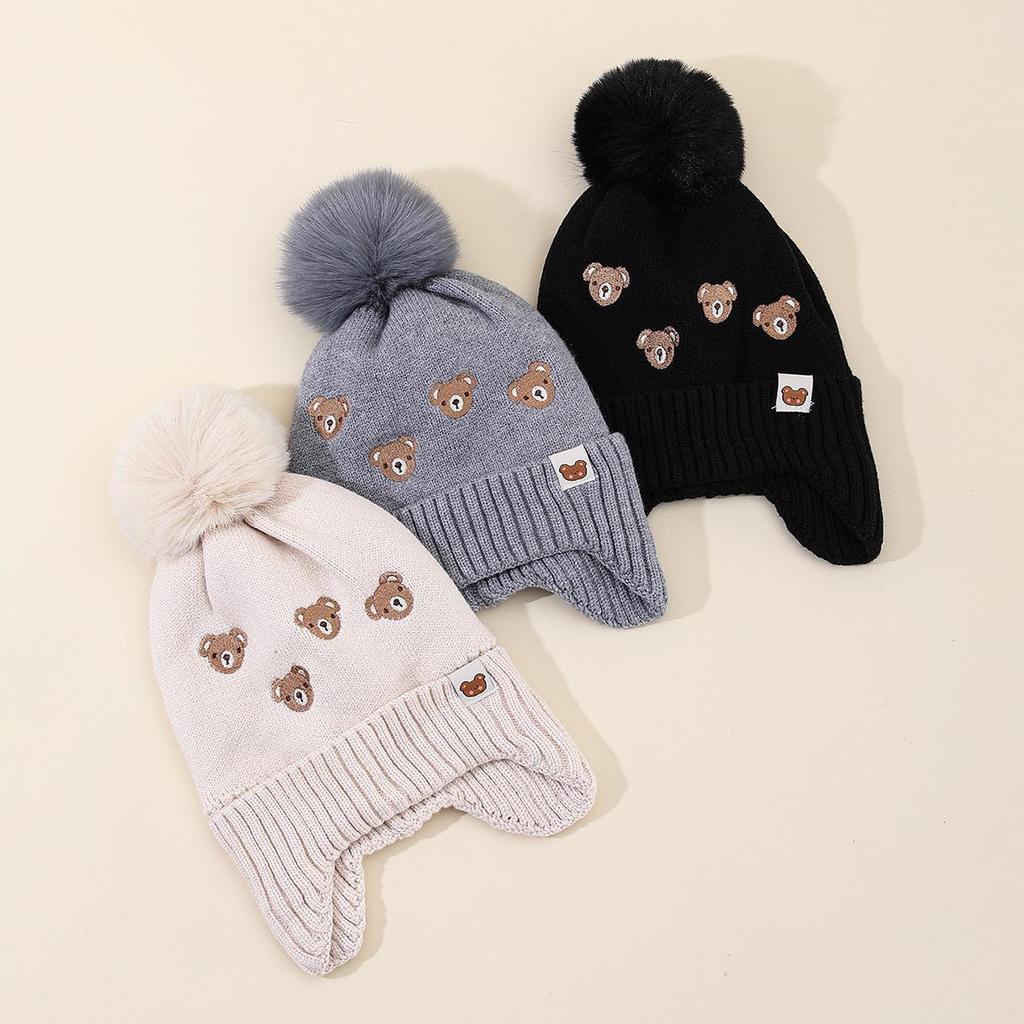 Children's Pompon Pullover Hat with Ear Protection - Embroidered Bear, Fleece-Lined for Autumn and Winter