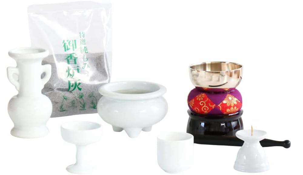 Buddhist Altar Set, Plain White Porcelain, 5 Pieces + Bell Set, Incense Burner Ash Included, for 49th Day Memorial Service, Altar Decoration