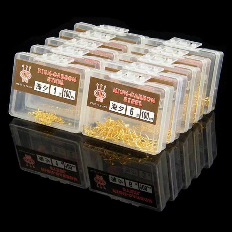 100pcs Haiyu Barbed Gold Fish Hooks Wild Fishing Long Shank Black Pit Tackle Supplies Boxed