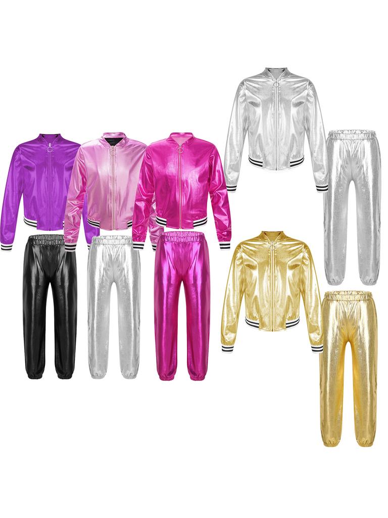 Kids Girls Metallic Long Sleeve Stand Collar Zipper Jacket with High Waist Pants for Sports Workout