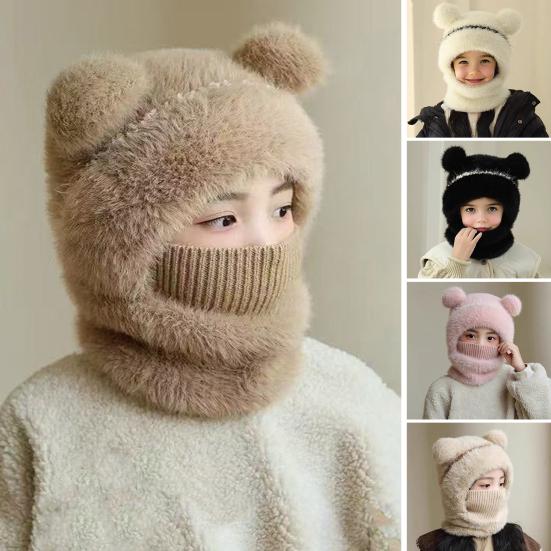 Children Hat with Face Guard Double Plush Ball Decor Solid Color Windproof Ear Protection Baby Hat Woolen Knitted Hat