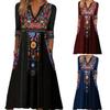 Robe longue ample à col incliné et ourlet trapèze, imprimé coloré, plissée, manches longues, style bohème