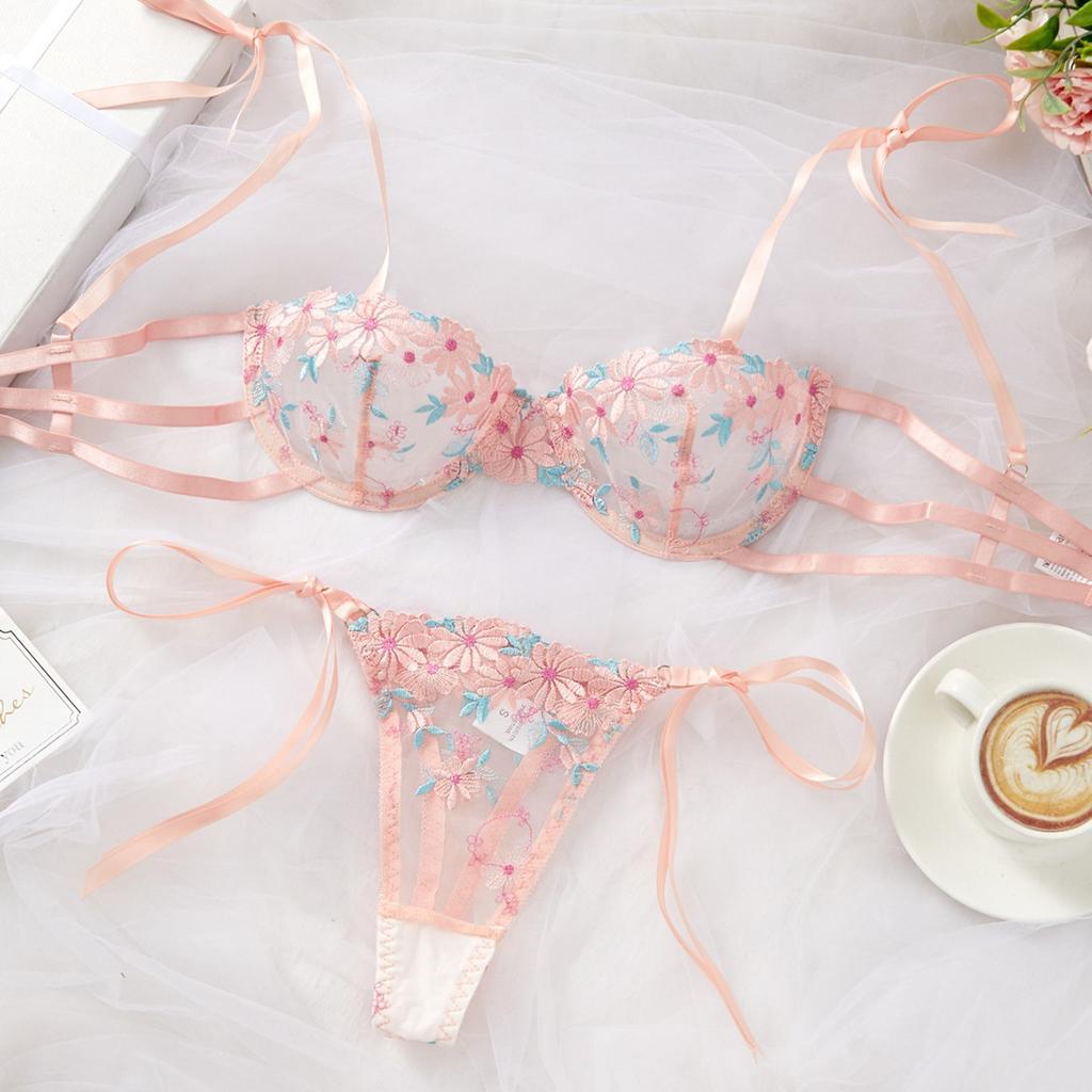 Off-white Ribbon Sexy Lingerie Skin-friendly Breathable Flower Lace Underwear Set Ultra-thin Embroidered Bra