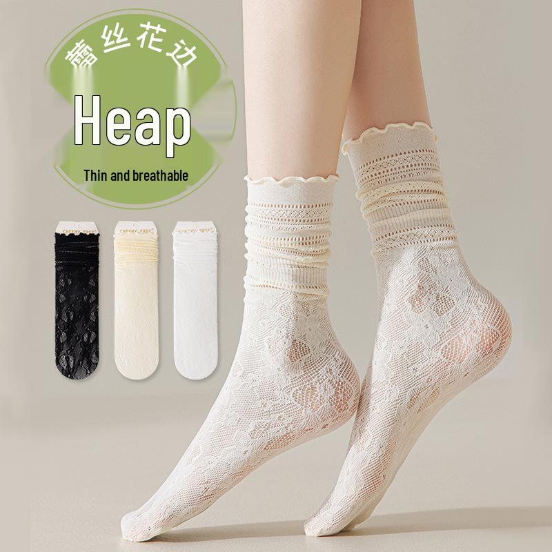 Chaussettes Blanches Froncées pour Femmes - Style d'Été Fin avec Bordure en Dentelle, Maille Respirante, Bord Frisé, Longueur Mi-Mollet.