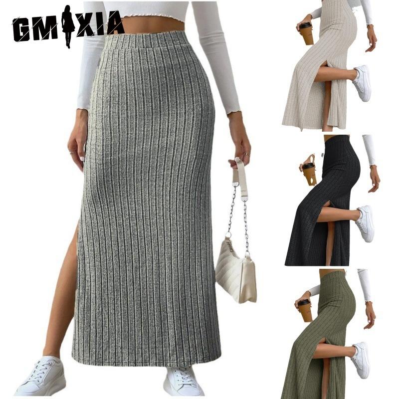 GMXIA Spring Summer High-waisted Side-slit Fitted Knitted Solid Color Women's Skirt