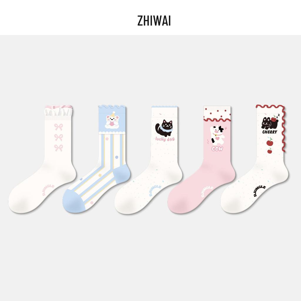 Cute Cartoon Lace Dot Yarn Socks - Women's Spring/Fall Mid-Calf Cotton Socks, Sweet Animal Design