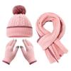 Ensemble 3 Pièces Chapeau Écharpe Gants pour Enfants Couleur Unie Texture Torsadée Décor Pompon Chapeau Écharpe Longue Gants Ensemble Accessoires d'Hiver Élastiques
