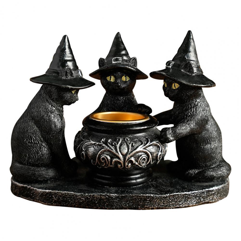 Festive Cat Decor Resin Black Cat Candle Holder with Witch Hat for Indoor Halloween Decor Spooky Tea Light Holder
