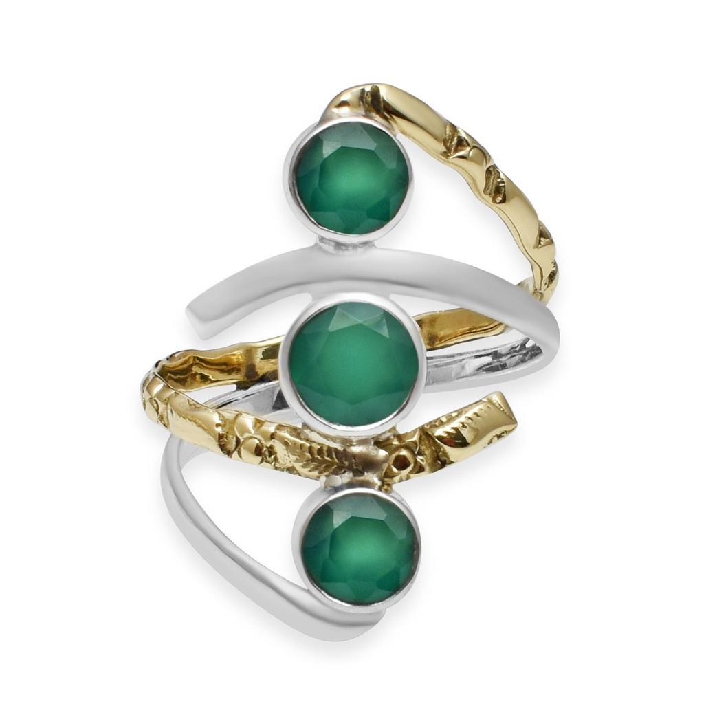 Natural Green Onyx Three Stone Eye Shape Ring Two Tone 925 Sterling Silver Bypass Ring For Women & Girls