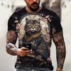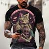 Modne męskie koszulki z nadrukiem kota samuraja japońskiego, zabawne koszulki z grafiką zwierząt 3D, luźne topy z okrągłym dekoltem, koszulki z krótkim rękawem
