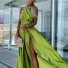 Kobiety ubierają plisowane długie wino czerwone eleganckie rozcięcie wysoki kołnierz Slim Fit bez rękawów Maxi stroje Plus rozmiar wieczorowe błyszczące suknie wieczorowe