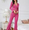 Damski Zestaw do Spania Casualowy Top z Długim Rękawem i Dekoltem w Serek ze Spodniami na Gumce Jesienny Wygodny Jednokolorowy Strój Domowy 2-częściowy Zestaw PJ