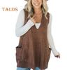Sweter damski z dekoltem w serek, bez rękawów, jednolity kolor, dzianinowa kamizelka z kieszeniami, ściągaczowe wykończenie, luźny krój, średniej długości, swobodny sweter