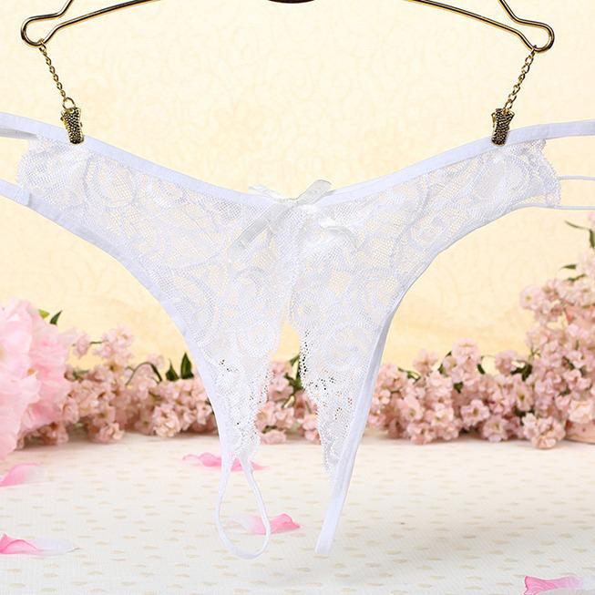 Koreańskie koronkowe przezroczyste stringi bez krocza: Seksowne, niskie w pasie, przewiewne, urocze siateczki z kokardką.