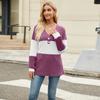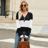 Spring Autumn Long Sleeve Button V Neck Color Block Pit Women Pullover T Shirt Blouse Top