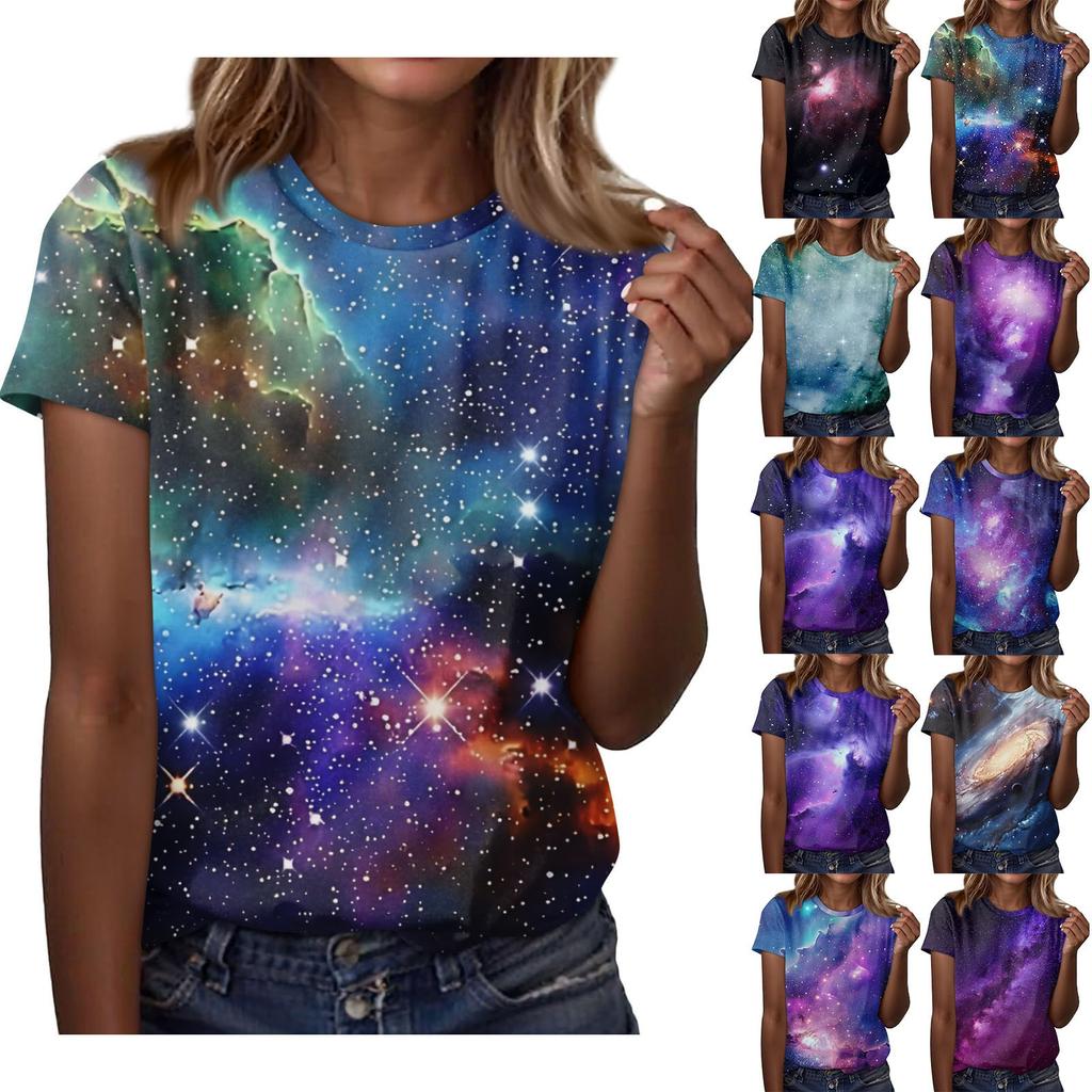 Damska luźna, swobodna koszulka z nadrukiem, okrągłym dekoltem, krótkim rękawem i pulowerem