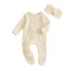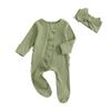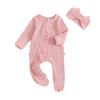 Jesienny strój dla noworodka dziewczynki, gładki prążkowany kombinezon zapinany na zamek z długim rękawem i falbanką, zestaw 2-częściowy z opaską z kokardą