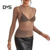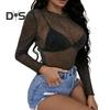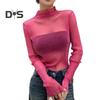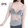 Damskie topy koronkowe z pół-wysokim dekoltem i długim rękawem T-shirt w jednolitym kolorze z prześwitującą siateczką i dolną częścią z przędzy