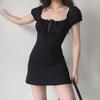 Women's Black Retro Lace Puff Sleeve Dress - Square Collar, Short Skirt