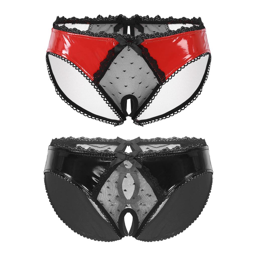 Damskie prześwitujące majtki stringi z koronkowymi wstawkami, błyszczące majtki z lakowanej skóry patentowej z otwartym kroczem i kokardką, niski stan