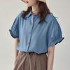 Damska letnia bluzka z podwiniętym kołnierzykiem i bufiastymi krótkimi rękawami
