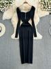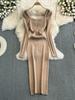 Autumn and Winter Long Sleeved Diamond Studded Square Collar with Cinched Waist for Slimming Effect Medium To Long Version Knitted Dress for Women