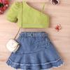 Garnitur dla dziewczynki Letni Dziecięcy Jednokolorowy Top z krótkim rękawem, Dżinsowa Plisowana Krótka Spódniczka Garnitur Pasek
