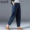 QICED Zamówić 9 kolorów o dwa rozmiary większe, Damskie letnie codzienne luźne bawełniano-lniane spodnie haremowe ze elastyczną talią, wyszczuplające spodnie do dziewiątej długości