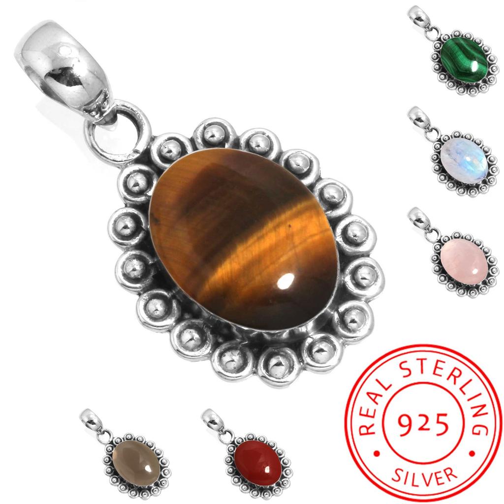 925 Sterling Silver Pendant Women Gemstone Handmade Jewelry Friendship Day Gift Malachite Moonstone Rose Quartz Red Stone Smoky Topaz Tiger Eye