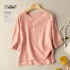 Damski T-shirt z bawełny i lnu z haftem: Jesień 2024 Luźny krój, Zakrywający brzuch, Wąski okrągły dekolt, Rękawy 3/4