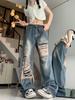 High Street Distressed Wide-Leg Ripped Jeans - Women's Autumn High-Waist Floor-Length