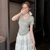 Damski T-shirt na wiosnę 2025 z koronkową wstawką, krótkim rękawem, wyszczuplający, z okrągłym dekoltem