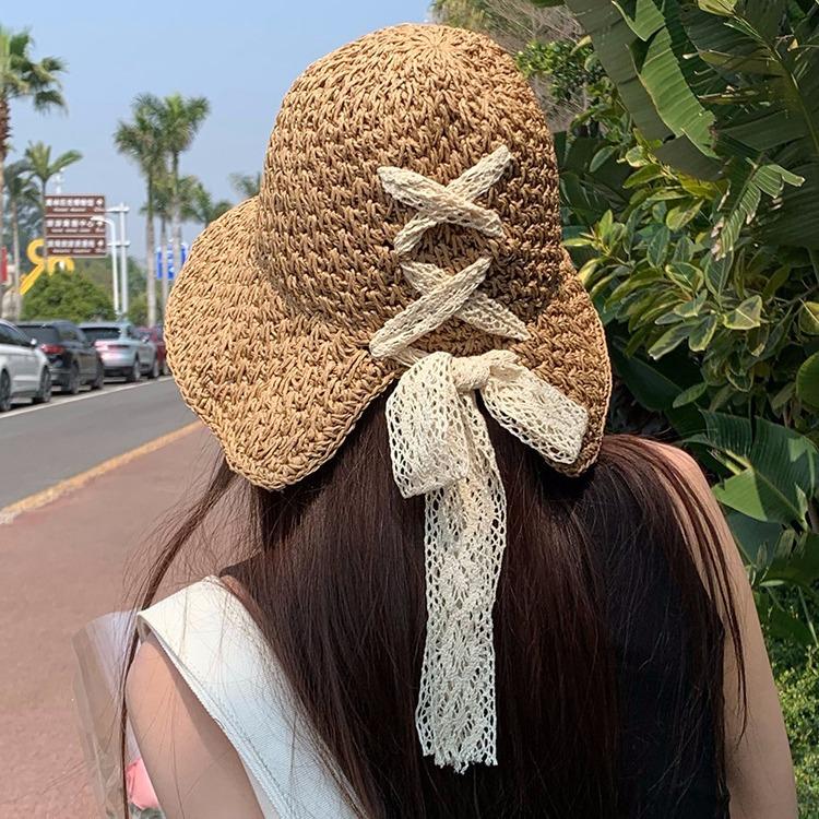 Lace strap straw hat women's summer beach sun hat seaside outing face protection sun hat